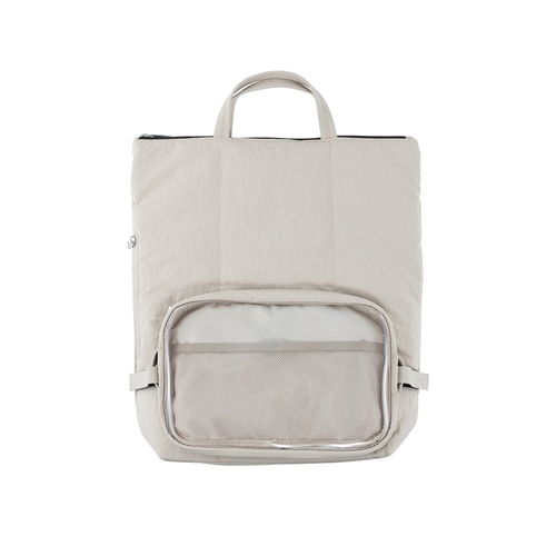 透明ポケットをくるっと裏返せば、シンプルリュックに擬態するバックパック。PCや雑誌なども入る大容量収納。PCは16inchまで収納可能。500mlのペットボトルも入る便利な横入れポケット。メインポケット仕切り付き、PC等の収納がしやすい設計。透明ポケットの内側には、缶バッジ等付けやすいあら目メッシュ。トートバッグにもなる2way仕様。まえポケットは、取り外してサコッシュにもなる(肩紐取り外し可能)。約540gの超軽量バックパック。クッション入りショルダーベルトで、肩への負担を軽減します。<ご使用上の注意>まえポケットの面ファスナーは、必ず最後までしっかり留めてご使用ください。ポケットが落下する恐れがあります。安全にお使いいただくため、まえポケットの耐荷重(約300g)を超えないようご注意ください。【検索ハッシュタグ】#ナカバヤシ#Nakabayashi#バックパック#リュックサック#デイパック#軽量設計#通勤通学用#カジュアルバッグ#大容量収納#ライトベージュ#PE素材#ナイロン素材#PVC素材#耐久性#男女兼用