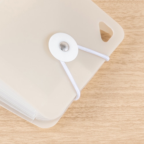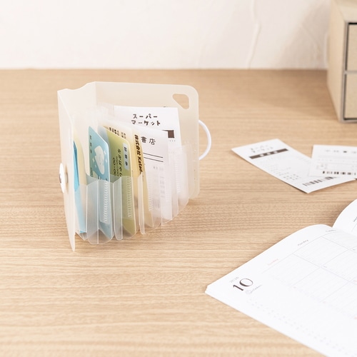 立てて使えるコンパクトサイズのドキュメントファイルです。大きく開くので、使いたいたいものがすぐに見つかります。ななめカットのポケットで高さのあるものの収納も安心です。miniサイズは、調味料の小袋や化粧品サンプル、カード類やレシートなど、バラバラしがちな小物の収納に。6仕切り7ポケットで、1週間区切りでの収納に。ハンドル付き。ワンタッチで開閉できるゴムバンド固定式を採用しています。