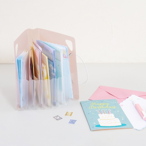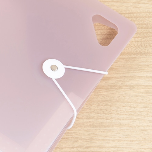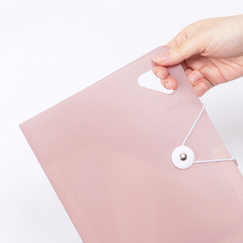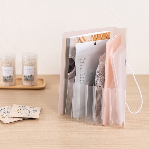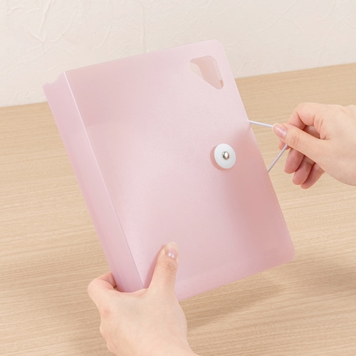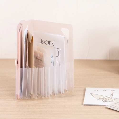 立てて使えるコンパクトサイズのドキュメントファイルです。大きく開くので、使いたいたいものがすぐに見つかります。ななめカットのポケットで高さのあるものの収納も安心です。A5サイズは、郵便物や薬袋、明細書などの散らかりがちな日常アイテムの収納に。6仕切り7ポケットで、1週間区切りでの収納に便利です。持ち運びやフックがけに便利なハンドル付き。ワンタッチで開閉できるゴムバンド固定式を採用しています。