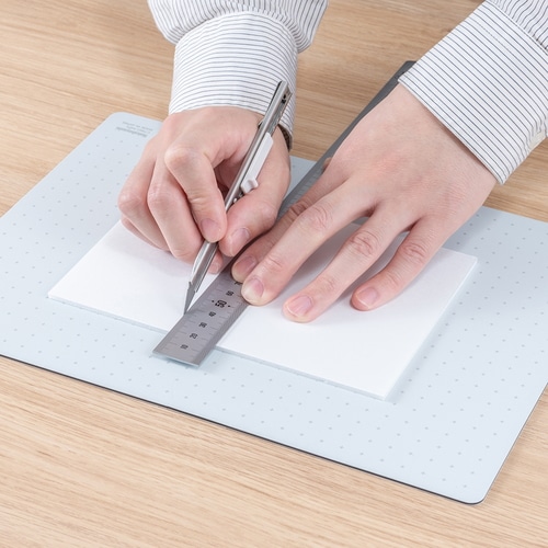 インテリアに馴染むミニマルデザイン。直角がわかりやすい格子罫線と、邪魔にならないドット罫線のいいとこどりの「十字罫線」仕様。 環境に配慮した「オレフィン系樹脂」を使用。持ち運びの際は半分に折りたたんでコンパクトに持ち運ぶことができます。場所やシーンを選ばない落ち着いたカラーの4色展開です。クリアは半透明素材のマットのためライトテーブルなどで透き通り、スクリーントーンや切り絵などのトレース作業に使用できます。【検索ハッシュタグ】#ナカバヤシ#折りたたみカッティングマット#クラフト作業マット#折りたたみ裁断マット#作業台カッターマット#デスク保護用マット#折り畳み工作マット#コンパクト工作台マット#折り畳み机用カッターマット#デザイン用マット#A4サイズマット#29.7cm×21cm#軽量折り畳みマット#模型用カッティング#クラフト机用マット