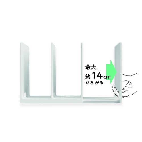 仕切りをスライドさせて、幅が拡がる。収納したいものを増やしたい時、収納物にあわせてワイドに拡がります。収納部の滑り止めでしっかりスタンド。最大約14cmひろがる。【検索ハッシュタグ】#ナカバヤシ#Nakabayashi#ブックスタンド#スライド調整式#幅可変#卓上収納#書類整理#ファイル立て#教科書整理#デスク整理#省スペース#自立式#軽量設計#シンプル形状