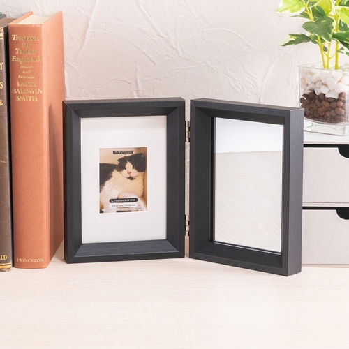 スタイリッシュな木製フレーム。玄関や化粧台、どんな部屋にも相性良し。鏡付きの2面フレーム。どこにでも置きやすいコンパクトなサイズ。写真が映えるマット付き。L判/チェキ判2サイズ対応。
