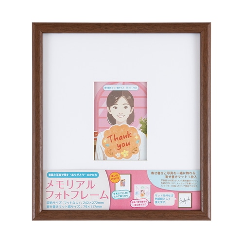 温かみのあるラウンド形状の木製フレーム。写真窓(L判用)がついた寄せ書きマット付き。マットを外せば色紙額として使用可能。
