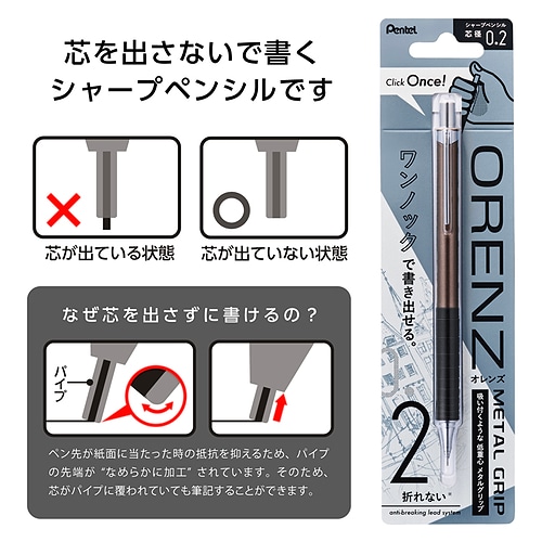 不思議なほど芯が折れないシャープペンシル。芯が減るのに合わせて先端パイプがスライドするオレンズシステム搭載。メタルグリップの重みで低重心となり、軽い筆圧での安定した筆記が可能に。長時間筆記しても疲れにくい、まるで紙に吸い付くような書き心地を実現しました。【検索ハッシュタグ】#ぺんてる#Pentel#シャーペン#シャープペン#シャープペンシル#オレンズ#オレンズメタル#折れない