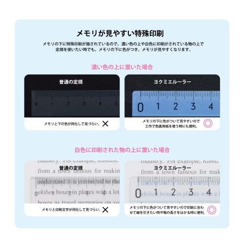 メモリの部分の色が変化する新感覚定規です。濃い色の上で長さを図りたい時に、大きい目盛側の下に色が出現することで同化して見づらかったメモリが見やすくなります。