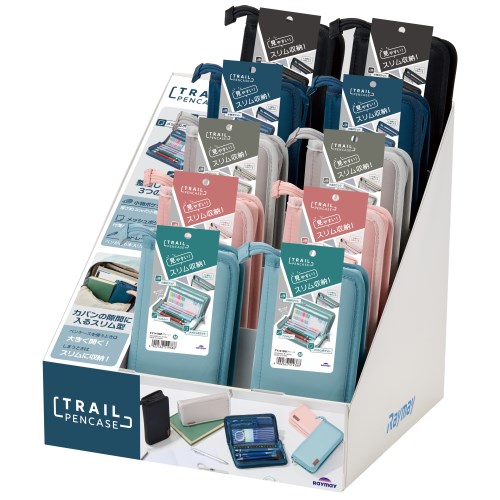 箱型の大容量ペンケースです。トレー部分に加えて特徴的な大きなポケットが付いているので、メモ帳加えて、ハサミや修正テープなど厚みのある小物もコンパクトに収納できます。スリム形状なのでカバンにコンパクトに収納できます。105°程で開いた状態で固定できるので携帯も横置き出来ます。