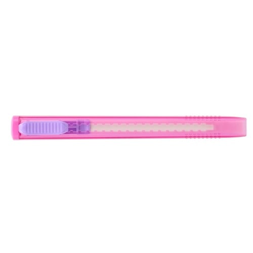 スマートにしまえるペンタイプの消しゴムです。ボディがクリアなのでレトロ感が出てかわいいのが特徴です。スライド部位が湾曲していて指にフィットするため上下しやすくなっています。また、スライド部位はなめらかにスライドできるのでストレスフリーな出し心地です。