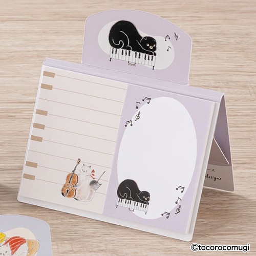 スタンド式の台紙が付いた、"立てられる"ふせんです。 表紙をくるっと回して裏表紙に差し込んで立てると、トコロコムギさんの描くちょっぴりあやしい猫たちのイラストがぴょこんと飛び出します。