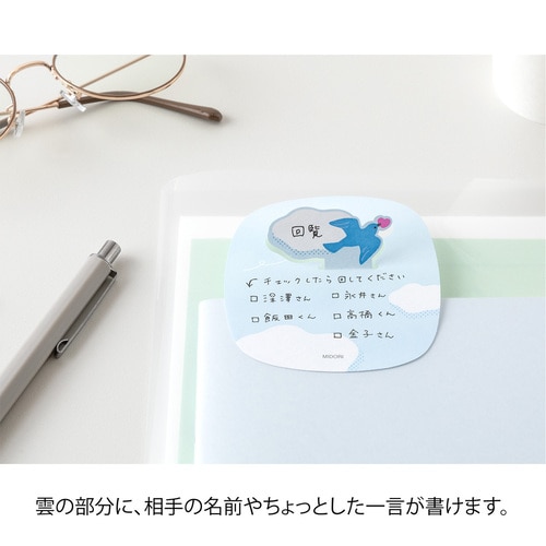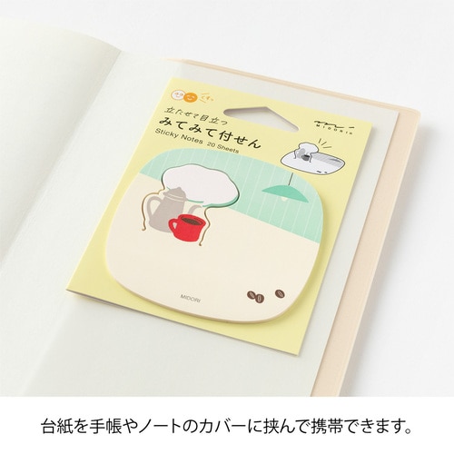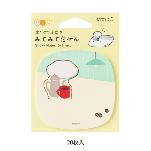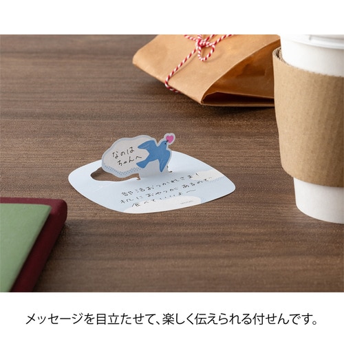 モチーフ部分(付せんの抜き部分)を立ち上げて、デスクの上などで目立たせられる付せんです。 ほっこりとしたストーリーを感じるデザインにしているので、受け取った方にメッセージと一緒に、心が緩むような時間を届けることができます。暮らしの中でのちょっとしたコミュニケーションにぴったりです。 「コーヒー柄」 落ち着いた雰囲気のコーヒータイムのデザイン。相手にちょっと一息入れて欲しいときのメッセージにもぴったりです。 湯気の部分に、相手の名前やちょっとした一言が書けます。