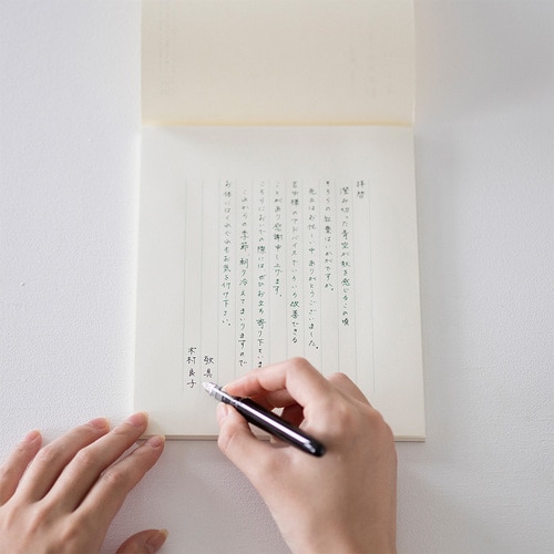 目に優しく、黒やブルーブラックのインクが映えるクリーム色の「MD用紙」を使用した便箋です。 「MD用紙」はにじみや裏抜けがしにくく、書き味の良さを追求し続けているオリジナルの筆記用紙です。 罫線色はやさしい色合いのグレーで、罫幅はゆったり気持ちよく文字を書けるよう広めの10mm。 手紙を書き終えたときに全体がすっきりと美しく見えるよう、周囲にも余白をたっぷりとったフォーマットです。 50枚入り。 縦罫11行(10mm幅)。