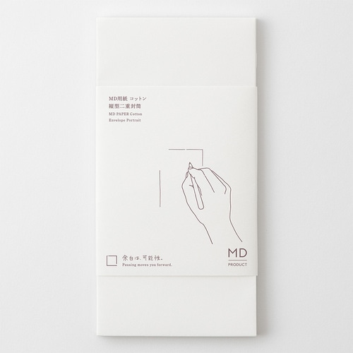 白く柔らかな「MD用紙コットン」を使用した封筒です。 「MD用紙コットン」はコットンパルプを20%配合することで、やさしい肌合いと、インクをやわらかく含むような上品な書き心地を愉しめる特別な用紙です。 二重構造で、折れにくく透けにくい仕立てです。 糊テープ付きで手軽に封ができます。 8枚入り。 二重封筒。 郵便番号枠なし。