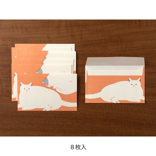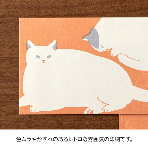 ちょっぴりラフなタッチで描かれた動物のシルエットの中に、気ままに文章を綴れる便箋です。罫線を設けていないため、字の大きさや筆記具にとらわれず、文字だけでなく絵も自由に描けるのが特徴です。たくさん書いても、少しだけ書いても、様になるデザインに仕上げました。色ムラやかすれのあるレトロな印刷と、スタイリッシュなカラーの組み合わせが絶妙なバランスを生み出しています。自由でほのぼのとした雰囲気が漂う個性派レターです。封筒は、裏と表に描かれている枠の中に宛名や差出人名を書いて、定形郵便として郵送できます。【検索ハッシュタグ】#デザインフィル#designphil#ミドリ#midori#かわいい#可愛い#おしゃれ#おすすめ#シンプル#大人#常備箋#レター#手紙#横書き##オレンジ#上品#記念日#誕生日#無罫#無地#高級#母#動物#ねこ#猫