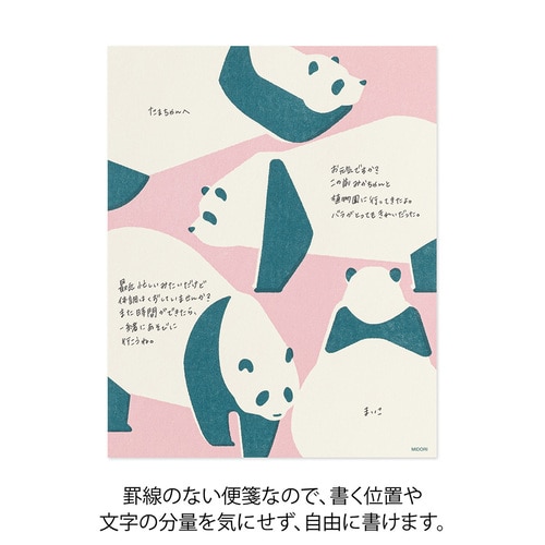 ちょっぴりラフなタッチで描かれた動物のシルエットの中に、気ままに文章を綴れる便箋です。罫線を設けていないため、字の大きさや筆記具にとらわれず、文字だけでなく絵も自由に描けるのが特徴です。たくさん書いても、少しだけ書いても、様になるデザインに仕上げました。色ムラやかすれのあるレトロな印刷と、スタイリッシュなカラーの組み合わせが絶妙なバランスを生み出しています。自由でほのぼのとした雰囲気が漂う個性派レターです。封筒は、裏と表に描かれている枠の中に宛名や差出人名を書いて、定形郵便として郵送できます。【検索ハッシュタグ】#デザインフィル#designphil#ミドリ#midori#かわいい#可愛い#おしゃれ#おすすめ#シンプル#大人#常備箋#レター#手紙#横書き##ピンク#上品#記念日#誕生日#無罫#無地#高級#母#動物#パンダ