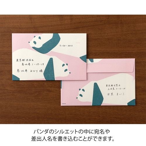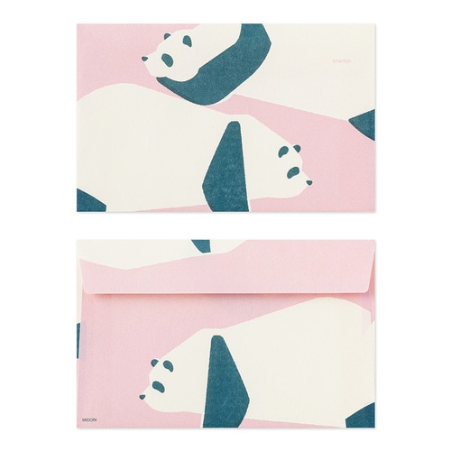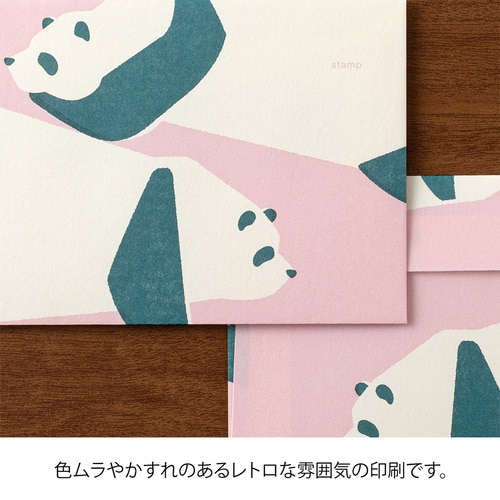 ちょっぴりラフなタッチで描かれた動物のシルエットの中に、気ままに文章を綴れる便箋です。罫線を設けていないため、字の大きさや筆記具にとらわれず、文字だけでなく絵も自由に描けるのが特徴です。たくさん書いても、少しだけ書いても、様になるデザインに仕上げました。色ムラやかすれのあるレトロな印刷と、スタイリッシュなカラーの組み合わせが絶妙なバランスを生み出しています。自由でほのぼのとした雰囲気が漂う個性派レターです。封筒は、裏と表に描かれている枠の中に宛名や差出人名を書いて、定形郵便として郵送できます。【検索ハッシュタグ】#デザインフィル#designphil#ミドリ#midori#かわいい#可愛い#おしゃれ#おすすめ#シンプル#大人#常備箋#レター#手紙#横書き##ピンク#上品#記念日#誕生日#無罫#無地#高級#母#動物#パンダ