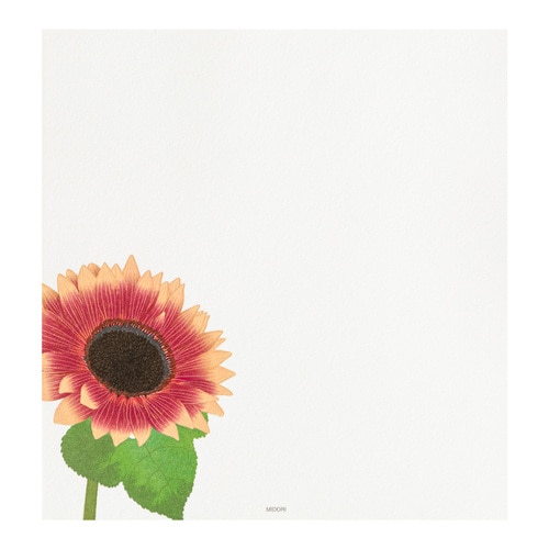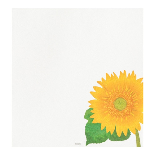 1000年もの時を重ねてきた伝統素材の和紙を用いて、四季折々の花々を大胆な構図でデザインした季節の便りです。 少ない文字数でも美しく完成される紙面デザインは「紙シリーズ」ならでは。 盛夏の鮮やかな柄をそろえました。 やさしい肌合いの越前和紙「越前鳥の子」(白)を使用しています。 夏の日差しの中、あざやかに咲く4種類のひまわりをアソート。 大きさや色など品種の異なるひまわりをアソートしました。 4柄各4枚、16枚入りです。 商品名:ミドリ 便箋 4柄入 ひまわり柄 81025006