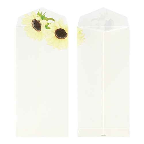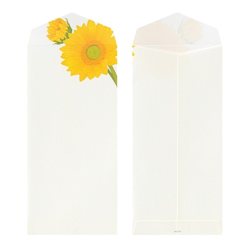 1000年もの時を重ねてきた伝統素材の和紙を用いて、四季折々の花々を大胆な構図でデザインした季節の便りです。 少ない文字数でも美しく完成される紙面デザインは「紙シリーズ」ならでは。 盛夏の鮮やかな柄をそろえました。 やさしい肌合いの越前和紙「越前鳥の子」(白)を使用しています。 夏の日差しの中、あざやかに咲く4種類のひまわりをアソート。 大きさや色など品種の異なるひまわりをアソートしました。 4柄各2枚の8枚入りです。 商品名:ミドリ 封筒 4柄入 ひまわり柄 81026006