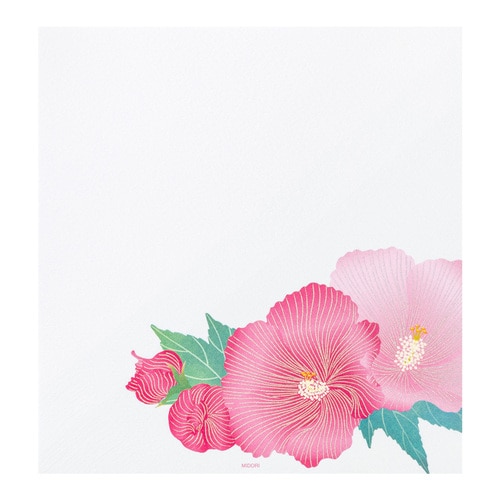 1000年もの時を重ねてきた伝統素材の和紙を用いて、四季折々の花々を大胆な構図でデザインした季節の便りです。 少ない文字数でも美しく完成される紙面デザインは「紙シリーズ」ならでは。 盛夏の鮮やかな柄をそろえました。 特有のハケ目がある風合いの良い伊予和紙(白)を使用しています。 朝、咲き始めの白色から夕方、ピンクへと花色が変化する様子が、お酒に酔っているようだと名付けられた「酔芙蓉」。 そんな不思議な花色を、角度によって色が変わり輝く偏光パールシルク印刷をのせて表現しました。 2柄各8枚、16枚入りです。 ※酔芙蓉(読み方:すいふよう) 商品名:ミドリ 便箋 シルク 酔芙蓉柄 81031006