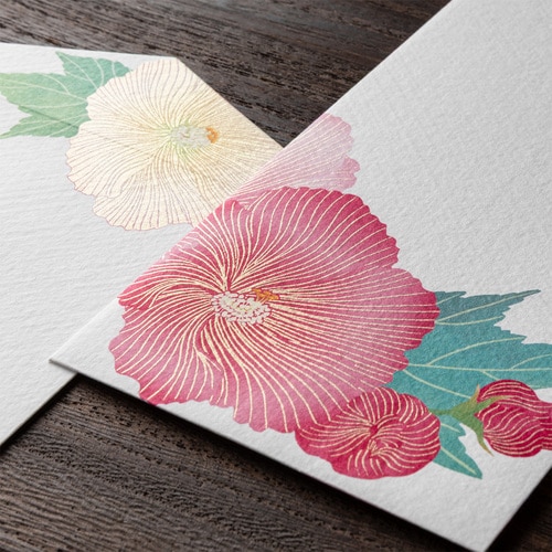 1000年もの時を重ねてきた伝統素材の和紙を用いて、四季折々の花々を大胆な構図でデザインした季節の便りです。 少ない文字数でも美しく完成される紙面デザインは「紙シリーズ」ならでは。 盛夏の鮮やかな柄をそろえました。 特有のハケ目がある風合いの良い伊予和紙(白)を使用しています。 朝、咲き始めの白色から夕方、ピンクへと花色が変化する様子が、お酒に酔っているようだと名付けられた「酔芙蓉」。 そんな不思議な花色を、角度によって色が変わり輝く偏光パールシルク印刷をのせて表現しました。 封筒は1柄6枚入りです。 商品名:ミドリ 封筒 シルク 酔芙蓉柄 81032006