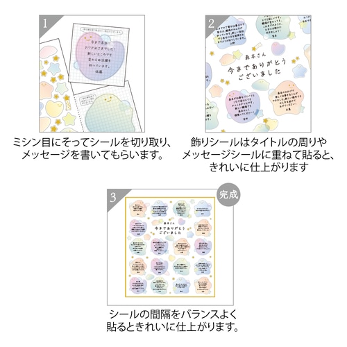 重ねて使える飾りシールがついた半透明の色紙用シールです。飾りシールには箔押し加工がされているので、タイトルやメッセージシールの周りを飾ると、華やかに仕上がります。「半透明 ふわふわ柄」:やさしい気持ちになるような、笑顔の入った絵柄のシールです。【検索ハッシュタグ】#デザインフィル#designphil#ミドリ#midori#かわいい#可愛い#おしゃれ#オシャレ#おすすめ#シンプル#大人#色紙#寄せ書き#メッセージ#シール#卒業#退職#異動#定年#結婚#引退#大人数#部活#高校#中学
