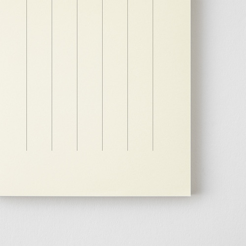 目に優しく、黒やブルーブラックのインクが映えるクリーム色の「MD用紙」を使用した一筆箋です。 「MD用紙」はにじみや裏抜けがしにくく、書き味の良さを追求し続けているオリジナルの筆記用紙です。 罫線色はやさしい色合いのグレーで、幅を広めにとった10mm罫なので、ゆったり余裕をもって書くことができます。 縦横自由にお使いいただけます。 手紙を書き終えたときに全体がすっきりと美しく見えるよう、周囲にも余白をたっぷりとったフォーマットです。 50枚入り。 縦罫5行(10mm幅)。