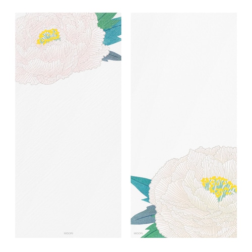 1000年もの時を重ねてきた伝統素材の和紙を用いて、四季折々の花々を大胆な構図でデザインした季節の便りです。 少ない文字数でも美しく完成される紙面デザインは「紙シリーズ」ならでは。 「寒牡丹柄」は、大輪の寒牡丹の花びら1枚1枚に輝きのあるパールシルク印刷を乗せて、繊細に表現しました。 特有のハケ目がある風合いの良い伊予和紙(白)を使用しています。 一筆箋は2柄各8枚の16枚入りです。 お礼状や贈り物の添え状など、さまざまなお付き合いのシーンでご活用ください。 商品名:ミドリ 一筆箋 冬レター シルク 寒牡丹柄 89598006【検索ハッシュタグ】#デザインフィル#designphil#midori#かわいい#可愛い#おしゃれ#オシャレ#おすすめ#シンプル#大人#紙シリーズ#和紙#冬#ウィンター#無罫#植物#花#レター#手紙#お祝い#上品#季節#芸術#アート