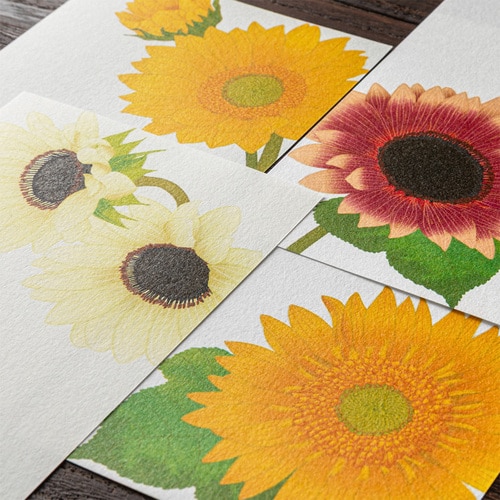 1000年もの時を重ねてきた伝統素材の和紙を用いて、四季折々の花々を大胆な構図でデザインした季節の便りです。 少ない文字数でも美しく完成される紙面デザインは「紙シリーズ」ならでは。 盛夏の鮮やかな柄をそろえました。 やさしい肌合いの越前和紙「越前鳥の子」(白)を使用しています。 夏の日差しの中、あざやかに咲く4種類のひまわりをアソート。 大きさや色など品種の異なるひまわりをアソートしました。 4柄各4枚、16枚入りです。 商品名:ミドリ 一筆箋 4柄入 ひまわり柄 89605006