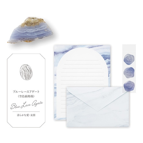 透明で立体的なシーリングワックス風シール付きの、鉱石をイメージしたレターセットです。ブルーレースアゲートのモチーフです。【検索ハッシュタグ】#レター#マルアイ#ミネラ#シーリング#ブルー