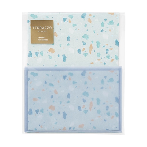 大理石や花崗岩などのかけらを混ぜ込んでつくる人造大理石「テラゾー(テラッツォ)」をイメージしたレターセット。淡い色味をベースにカラフルな模様が散りばめられた、遊び心のあるデザインです。製品寸法:[封筒]148×98mm、[便箋]138×182mm。封筒3枚、便箋6枚、宛名シール3枚。【検索ハッシュタグ】#レター#下敷#マルアイ#テラッツォ#おしゃれ#かわいい#A6