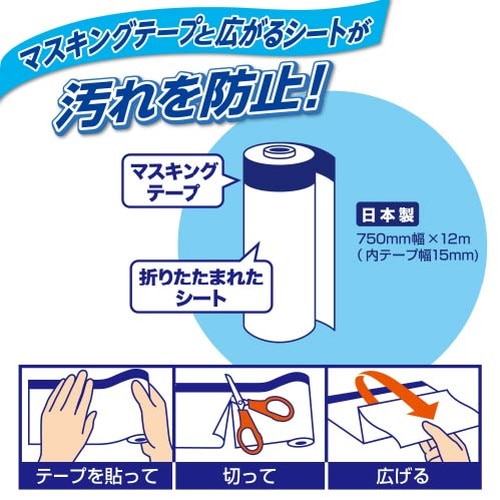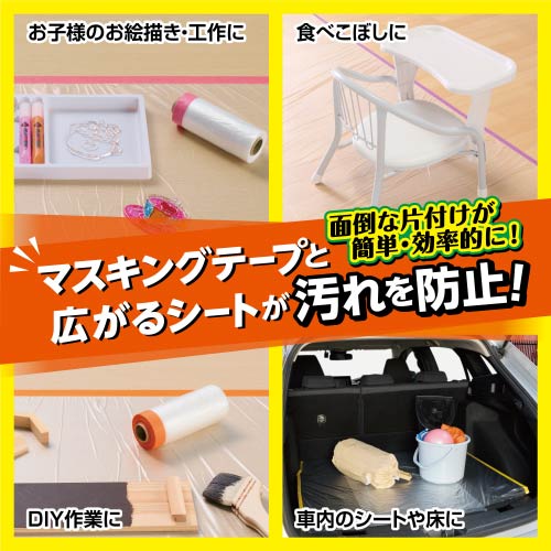 ・マスキングテープと折りたたまれた養生シートが一体になった商品。テーブルや床などに敷くことで汚れを防ぐ。使用後は丸めて捨てるだけで片付けが簡単・効率的に済ませられる・家庭、外出時などいろいろな用途に使えて便利・日常で使いやすい粘着力、サイズを選定・シートの表面処理によりひらひらせず床などに吸着し使いやすい(風などで捲れる場合は仮止めテープで端を留める) 【検索ハッシュタグ】#片付け#簡単#マスカー#掃除#シート#マスキング#テープ#汚れ#防止#防ぐ#お絵描き#クレヨン#グラスデコ#カラリックス#食べこぼし#DIY#防災#ヤマト