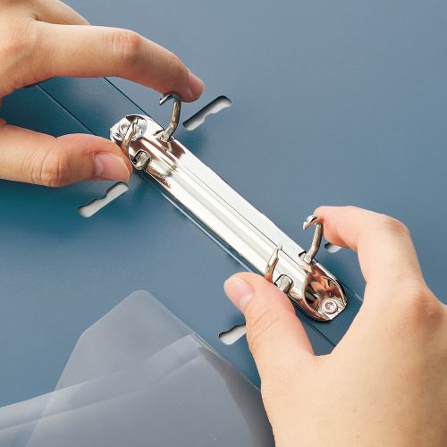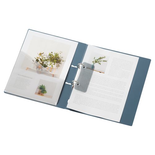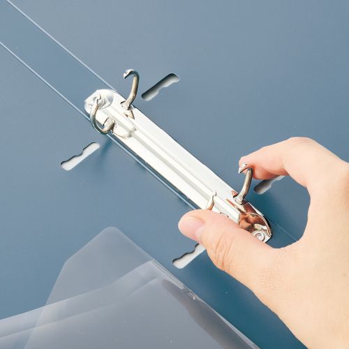 リングを時計回りにひねると簡単に開くツイストリングを使用したリングファイルです。リングを高くすることで、同じ背幅のリングファイルより最大収容枚数が30枚アップし、省スペースで収納することができます。