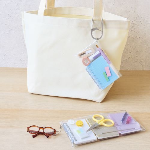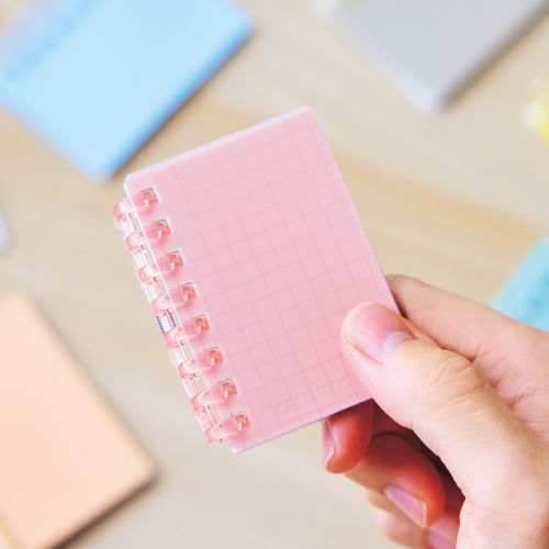 小さくて可愛い手のひらサイズのノートで、ちょっとしたメモ書きに便利です。透明のポーチに入れて、バッグチャームとして可愛く持ち運びができます。とじ具が開くのでリーフの抜き差しが可能です。