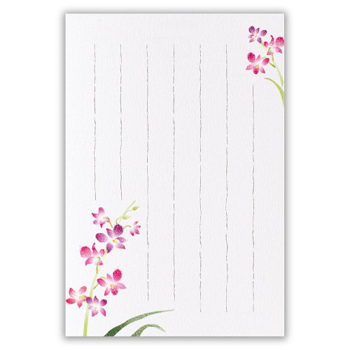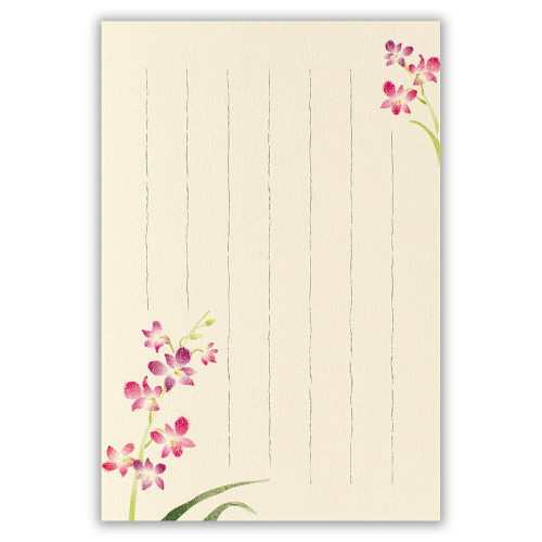 書いたときのイメージがしやすいよう、表紙に文例を載せました。 艶やかなデンファレ(洋ラン)をあしらったはがき箋です。 丁寧な気持ちが伝わるように優しく上品に仕上げました。 あたたかい紅色の花々が文章を引き立てます。