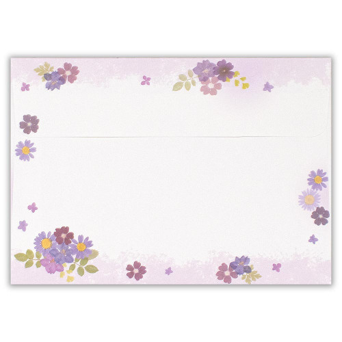 4柄のデザインを楽しめる、12枚入りのボリュームタイプの封筒です。通年お使いいただける花柄で、押し花の絵柄が宛名を引き立てます。爽やかな水色や可愛らしい紫、おしゃれな青や優しいグリーンのデザインは、気分に合わせて自由にお使いいただけます。