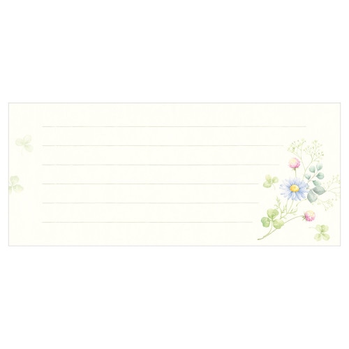 佳乃 -よしの- 通年お使いいただける、上品な2柄アソートの一筆箋です。 クローバーやデイジー、かすみ草など身近な花々を柔らかいタッチで描きました。 落ち着きのある和紙の風合いと楚々とした花のデザインで、ご挨拶やお礼、お見舞い、目上の方へのお手紙など幅広くお使いいただけます。