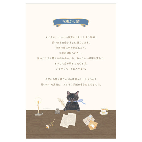 RESSA PANDA BOOKS まるで物語のワンシーンを贈るように…。優しい絵柄がメッセージを彩る便箋です。レッサーパンダ書店の店主がおすすめする物語「夜更かし猫」の4場面が描かれています。 「夜更かし猫」は、ついつい夜更かしをしてしまう猫が長い夜を楽しむお話です。【検索ハッシュタグ】#4柄アソート#ヨコ10行罫#奉書紙#和紙#扉絵付#物語#ファンタジー#黒猫#どうぶつ#かわいい#おしゃれ#本#手紙#夜