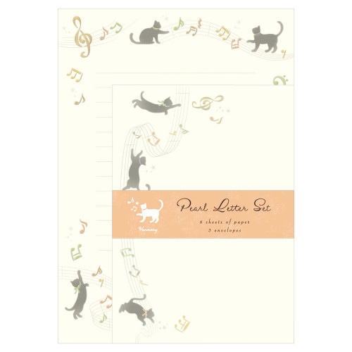 パールの輝きが華やかなA5サイズのレターセットです。 便箋にはエンボス加工も施しています。 音符と戯れる黒猫たちが可愛らしいデザインです。