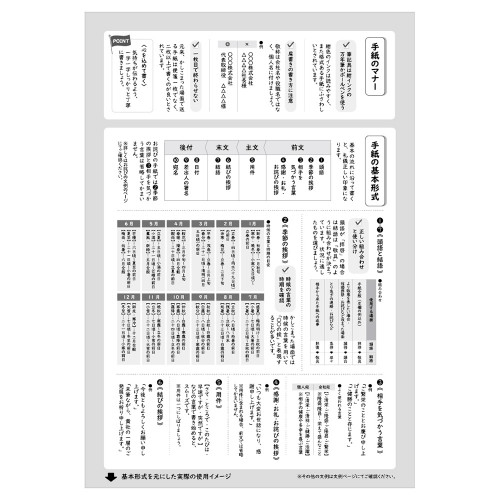 手紙文化振興協会 代表理事 むらかみかずこ監修 ビジネスの現場で役立つ、手紙の書き方と文例付の便箋です。 白地の縦書で、ビジネスシーンでのお礼やお詫びといったフォーマルなシーンでもお使いいただけます。 【付録】 <手紙の書き方> 手紙のマナー、手紙の基本形式、季節の挨拶を収録。書き方に迷ったときにすぐ確認できます。 <使用イメージ> 手紙の基本形式を元にした実際の使用イメージ。文字の位置や大きさの参考にご活用いただけます。 <文例> ビジネスシーンに合わせた5種の文例。(お礼状・送り状・商品のご案内・異動の挨拶・お詫び状) 応用に便利な解説付です。 監修者紹介 一般社団法人手紙文化振興協会 代表理事 むらかみかずこ 幼少の頃からの手紙好きが高じて、手紙名人と呼ばれるようになる。 「手書きのひと言でお客様がファンになる」企業研修実績多数。NHK Eテレ「まる得マガジン」一筆箋講師、毎日放送「プレバト!」一筆箋講師他、メディア実績多数。著書・監修書多数。