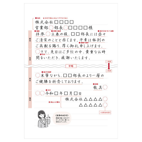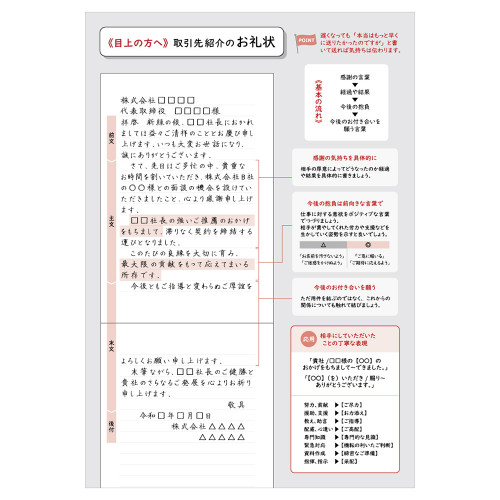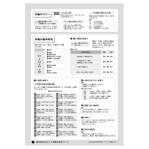 手紙文化振興協会 代表理事 むらかみかずこ監修 ビジネスの現場で役立つ、手紙の書き方と文例付の便箋です。 白地の横書で、フォーマルなシーンでもお使いいただけます。 【付録】 <手紙の書き方> 手紙のマナー、手紙の基本形式、季節の挨拶を収録。書き方に迷ったときにすぐ確認できます。 <使用イメージ> 手紙の基本形式を元にした実際の使用イメージ。文字の位置や大きさの参考にご活用いただけます。 <文例> ビジネスシーンに合わせた5種の文例。(お礼状・送り状・商品のご案内・異動の挨拶・招待状) 応用に便利な解説付です。 監修者紹介 一般社団法人手紙文化振興協会 代表理事 むらかみかずこ 幼少の頃からの手紙好きが高じて、手紙名人と呼ばれるようになる。 「手書きのひと言でお客様がファンになる」企業研修実績多数。NHK Eテレ「まる得マガジン」一筆箋講師、毎日放送「プレバト!」一筆箋講師他、メディア実績多数。著書・監修書多数。