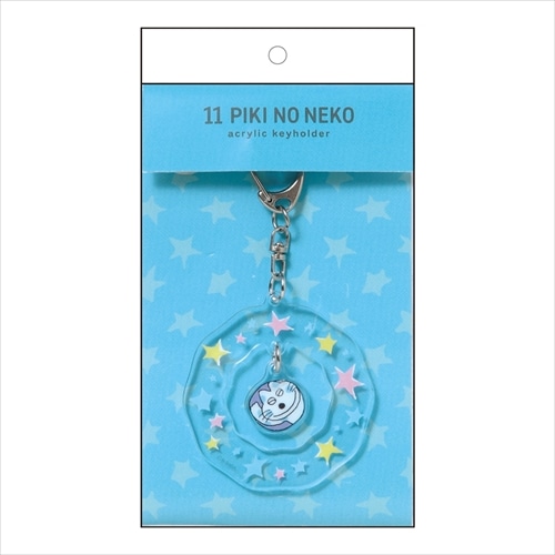 「11ぴきのねことへんなねこ」に登場する、宇宙船の窓からのぞくへんなねこをデザインしたダイカットのアクリルキーホルダーです。星に囲まれた中央のねこは揺れる仕様になっており、動きのあるかわいらしさを楽しめます。