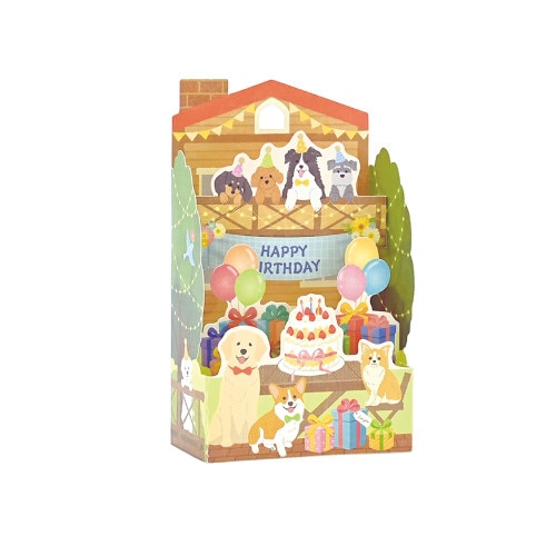 ミニチュア風のおうち型のバースデーカード。 デスクや棚に立てて飾れます。 犬たちがガーデンパーティーを開いて誕生日をお祝いしてくれるデザインです。