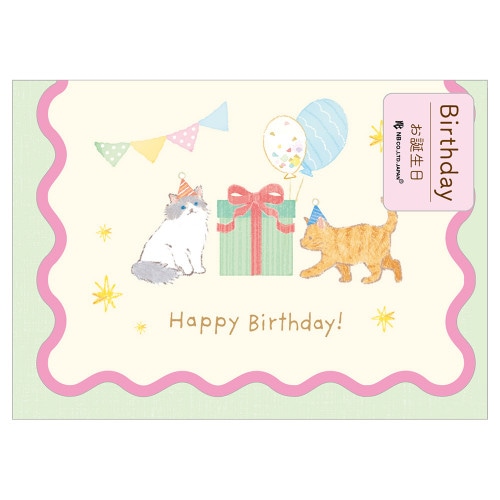My mood -マイムード- 明るく楽しい気分を引き出す、軽やかなカラーのシリーズ。 プレゼントに添えるのにぴったりな、ミニサイズのバースデーカードです。 猫やケーキ、風船、プレゼントを優しく描きました。※郵送できません