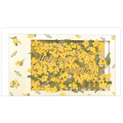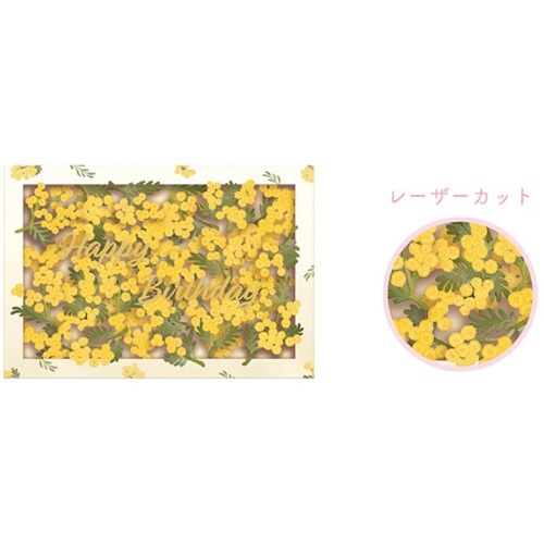 レーザーカットされたミモザのモチーフが華やかなバースディカード。カードの裏面にメッセージが書き込めます。封筒付。