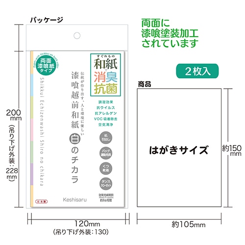 歴史と伝統的な素材の漆喰と越前和紙の組み合わせで強アルカリ性の商品が誕生し、消臭、抗菌、抗ウィルス、抗アレルゲン、調湿効果、VOS吸着除去、空気清浄などに効果があります。
