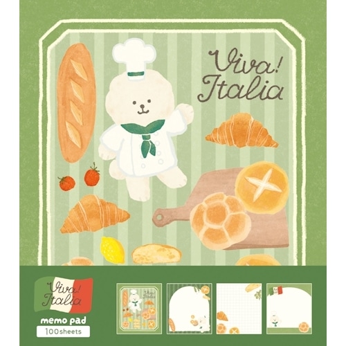 イタリアの風そよぐ、小さなレストラン「Viva! Italia」へようこそ!個性豊かなシェフたちがとっておきのメニューをあなたへお届けします。4柄×25枚のたっぷり100枚綴りのメモパッドなので気軽にお使いいただけます。