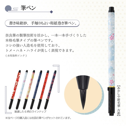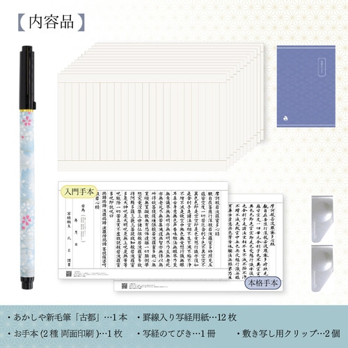 こころ落ち着く写経をしていただくために、悠々と書ける工夫を凝らした写経セットです。 ●あかしや新毛筆「古都」(水性染料インク): 奈良筆の製筆技術を生かし、一本一本手づくりした穂先は本格毛筆の書き味。コシの強い人造毛を使用しており、点画がしっかりとした楷書の線質を美しく表現できます。 ●写経用紙(504×290mm): 罫線入りの写経用紙です。一般的な写経用紙より行幅を広めに調整し、ゆったりと文字を書きやすいサイズにしております。お手本と重ねて敷き写しがしやすい薄口ながら、上品な色味と質感の「楮紙」で、にじみが少なく、初心者も集中して書くことができます。また、墨の裏うつりも少なく、敷き写しした際にお手本が汚れません。 ●お手本: 般若心経のお手本2種付きです。 <入門手本>わかりやすい「現代漢字」で、初心者も迷わず書ける <本格手本>写経独特の「写経体」で、繊細かつ力強い筆づかい ●写経のてびき: 般若心経の全文と現代語訳や、写経の進め方について、はじめての方にも取り組みやすいよう簡単に解説しています。 ●敷き写し用クリップ: 敷き写しをする際は、上部2箇所をクリップで固定すると、紙がずれず安定して書くことができます。 【セット内容】 あかしや新毛筆「古都」1本、罫線入り写経用紙12枚、お手本(2種 両面印刷)1枚、写経のてびき1冊、敷き写し用クリップ2個