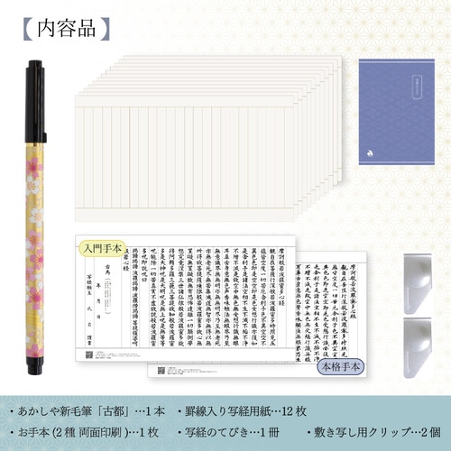 こころ落ち着く写経をしていただくために、悠々と書ける工夫を凝らした写経セットです。 ●あかしや新毛筆「古都」(水性染料インク): 奈良筆の製筆技術を生かし、一本一本手づくりした穂先は本格毛筆の書き味。コシの強い人造毛を使用しており、点画がしっかりとした楷書の線質を美しく表現できます。 ●写経用紙(504×290mm): 罫線入りの写経用紙です。一般的な写経用紙より行幅を広めに調整し、ゆったりと文字を書きやすいサイズにしております。お手本と重ねて敷き写しがしやすい薄口ながら、上品な色味と質感の「楮紙」で、にじみが少なく、初心者も集中して書くことができます。また、墨の裏うつりも少なく、敷き写しした際にお手本が汚れません。 ●お手本: 般若心経のお手本2種付きです。 <入門手本>わかりやすい「現代漢字」で、初心者も迷わず書ける <本格手本>写経独特の「写経体」で、繊細かつ力強い筆づかい ●写経のてびき: 般若心経の全文と現代語訳や、写経の進め方について、はじめての方にも取り組みやすいよう簡単に解説しています。 ●敷き写し用クリップ: 敷き写しをする際は、上部2箇所をクリップで固定すると、紙がずれず安定して書くことができます。 【セット内容】 あかしや新毛筆「古都」1本、罫線入り写経用紙12枚、お手本(2種 両面印刷)1枚、写経のてびき1冊、敷き写し用クリップ2個