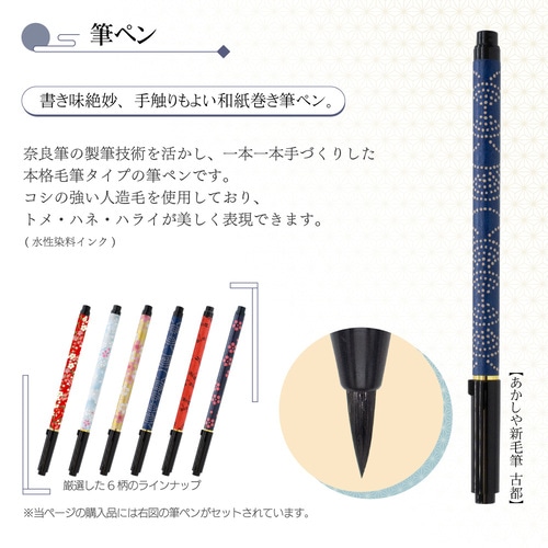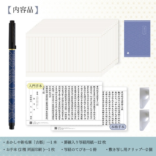 こころ落ち着く写経をしていただくために、悠々と書ける工夫を凝らした写経セットです。 ●あかしや新毛筆「古都」(水性染料インク): 奈良筆の製筆技術を生かし、一本一本手づくりした穂先は本格毛筆の書き味。コシの強い人造毛を使用しており、点画がしっかりとした楷書の線質を美しく表現できます。 ●写経用紙(504×290mm): 罫線入りの写経用紙です。一般的な写経用紙より行幅を広めに調整し、ゆったりと文字を書きやすいサイズにしております。お手本と重ねて敷き写しがしやすい薄口ながら、上品な色味と質感の「楮紙」で、にじみが少なく、初心者も集中して書くことができます。また、墨の裏うつりも少なく、敷き写しした際にお手本が汚れません。 ●お手本: 般若心経のお手本2種付きです。 <入門手本>わかりやすい「現代漢字」で、初心者も迷わず書ける <本格手本>写経独特の「写経体」で、繊細かつ力強い筆づかい ●写経のてびき: 般若心経の全文と現代語訳や、写経の進め方について、はじめての方にも取り組みやすいよう簡単に解説しています。 ●敷き写し用クリップ: 敷き写しをする際は、上部2箇所をクリップで固定すると、紙がずれず安定して書くことができます。 【セット内容】 あかしや新毛筆「古都」1本、罫線入り写経用紙12枚、お手本(2種 両面印刷)1枚、写経のてびき1冊、敷き写し用クリップ2個