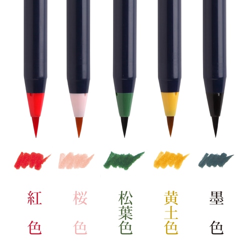 水性染料インクが再現する美しい日本の伝統色。 描き味に色彩にこだわったカラー筆ペンです。毛筆のタッチを活かして、大胆に繊細に描くことはもちろん、水を穂先に含ませたり、紙をあらかじめ湿らせることで、やわらかな濃淡も自在に表現できます。混色して自由に色をつくることもできます。 水彩画、スケッチにイラスト、写経まで、多彩な使い方ができます。 【セット色】 紅色、桜色、松葉色、黄土色、墨色