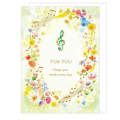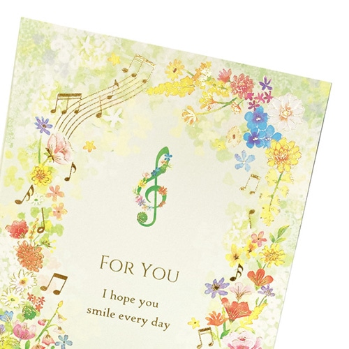 “FOR YOU”の文字に音符や花が踊り、音楽が聞こえてきそうなデザインのカードです。