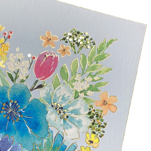 相手を選ばず、どんなシーンでも使いやすい定番の花柄です。様々な形の花のシールを貼ってブーケを完成させていくような楽しいカードです。 さわやかなブルーはピンクが苦手な方や、男性にも贈りやすくおすすめです。シール8片付き【検索ハッシュタグ】#チキュウ#寄せ書き#色紙#少人数#花柄